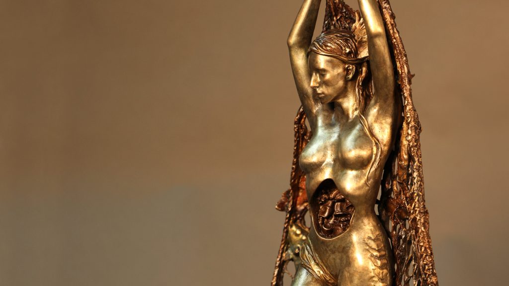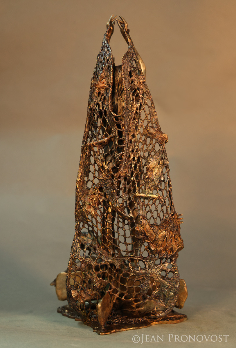 À la base de la sculpture se trouvent des ossements massifs de baleine, qui comme on le sait est le plus grand des mammifères marins. C’est à dessein que ces ossements servent de piédestal à la femme, puisqu’ils évoquent ainsi la tragédie de la baleine, qui à cause du mode de vie de cette espèce humaine minuscule par comparaison, est prématurément en voie de disparition. Sont également mis en scène un héron, une grenouille et un canard recouvert de pétrole. Victime des mutations génétiques causées par son environnement empoisonné, le héron n’a pas deux, mais trois pattes. Preuve vivante des terribles répercussions de la surutilisation de matières plastiques ainsi que de produits chimiques et pharmaceutiques, le héron, tout comme nous, s’entête à consommer à sa guise sans se soucier de savoir de quoi il retourne. Et pourtant, c’est ce je-m’en-foutisme même qui est à l’origine de l’altération pathologique de son corps. La grenouille, elle, est une créature au symbolisme particulier, dans la mesure où elle représente aussi bien la force que la fragilité. C’est entre autres en se fiant à l’état de la grenouille que l’on comprend que son environnement se détériore. En effet, lorsque les eaux dans lesquelles elle vit sont polluées, la grenouille est le premier organisme victime d’anomalies génétiques, et le premier à disparaître. Remarquez cependant que la grenouille figurant dans la sculpture résiste aux assauts du héron : sa résistance symbolise la persévérance de la nature. La grenouille a beau sembler insignifiante, elle peut néanmoins en imposer autant que cette dernière. Ainsi, que l’on ne s’imagine pas être l’espèce la plus évoluée de la nature, car celle-ci n’en a que faire : on a beau continuer à évoluer malgré notre comportement destructeur à son égard, sa supériorité l’empêchera de succomber et la fera foisonner de nouveau lorsque nous serons disparus. Quant au canard recouvert de pétrole, il symbolise parfaitement à quel point l’émancipation de notre espèce se fait au détriment de la nature. Autrement dit, on s’en balance des hérons, des grenouilles, des canards, des lacs et des océans : nos voitures ont besoin d’essence, point ! On remarque par ailleurs des poissons mutants pris dans le filet de pêche, qui s’étend d’ailleurs du dessous de la base jusqu’au sommet de la sculpture. Parmi ces poissons, certains sont bicéphales et d’autres ont trois paires de nageoires, signes de l’altération pathologique de leurs caractéristiques naturelles. Ce qu’il faut saisir ici, c’est qu’en polluant avec autant d’insouciance, nous n’avons pas remarqué les dégâts que nous avons causés aux créatures aquatiques. Résultat : elles évoluent et se transforment au même rythme que nous. Aussi, même si la femme semble prise dans le filet contre son gré, ce que le symbolisme ambiant communique, c’est qu’elle est elle-même à l’origine de sa capture. C’est donc dire qu’elle est victime de sa propre ignorance et de ses propres excès. À en juger par ses yeux clos cependant, elle fait délibérément fi des répercussions de ses gestes. De plus, à en juger par sa pose marquée par la soumission, on en déduit qu’elle préfère tout simplement être belle, s’enivrer et croire à tort qu’elle est au sommet de la pyramide alimentaire. Qu’elle soit prise semble lui importer peu.