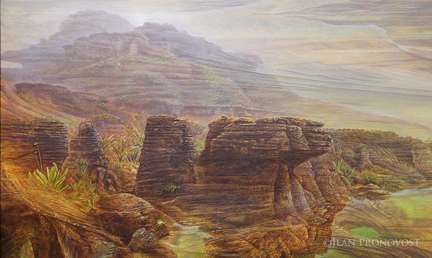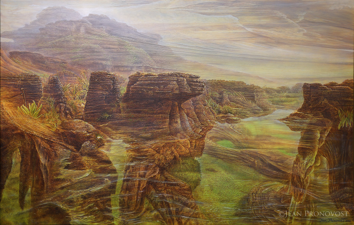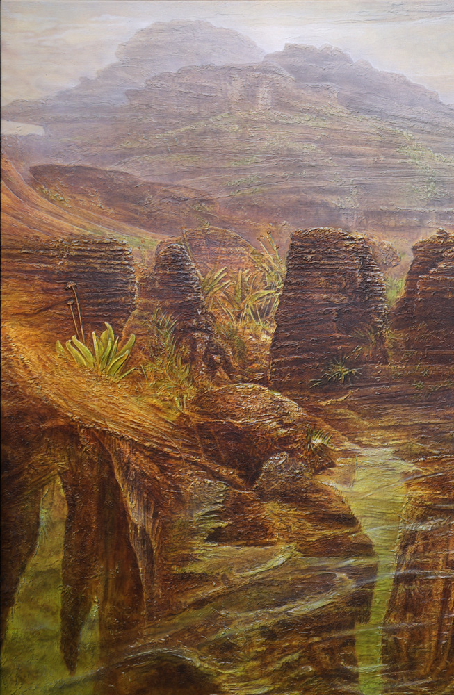 This painting, imbued with mysticism and primal energy, draws its origin from a two-week expedition undertaken by the artist to Mount Roraima, one of the oldest geological formations on Earth.